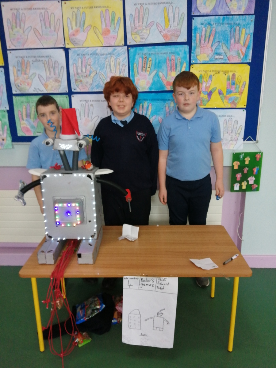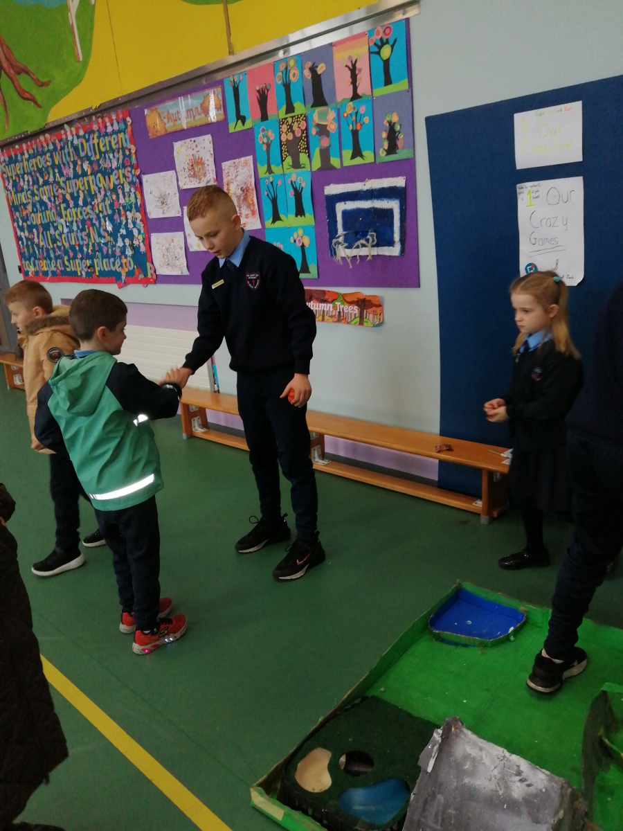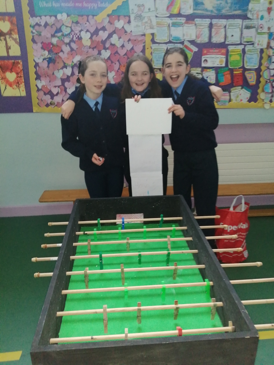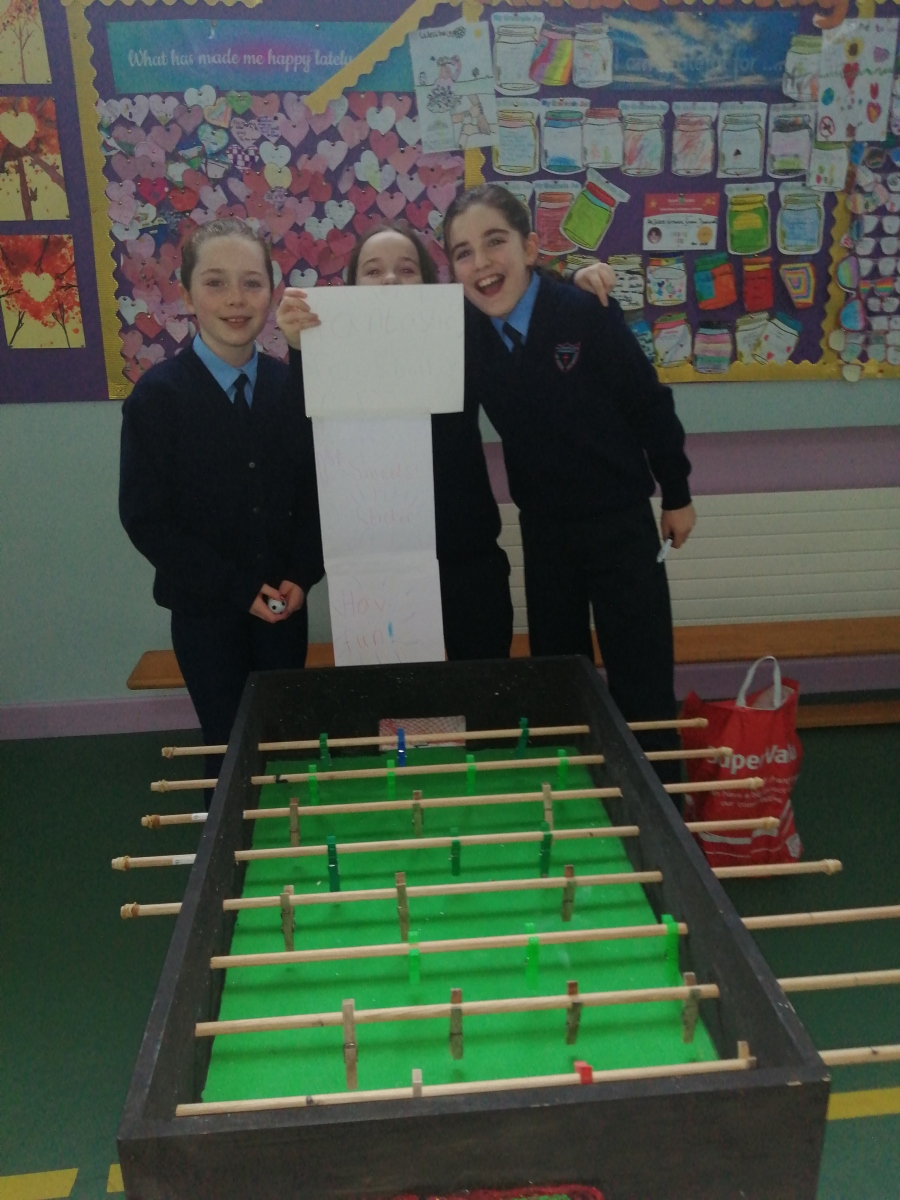 All pupils were asked to vote for their favourite play activity which resulted in Michael,Finlay and Joe with their Winter Wonderland creation receiving the most votes.In second place was the Crazy golf game which was created by Evin,Cian and Zach. The Foosball table won third place and was created by Elaine,Katie and Carragh.